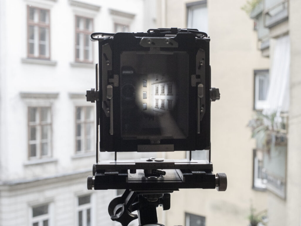 Begonnen hat es als Spiel, als Experiment, geht das überhaupt? Mit welcher Linse? Welches Objektiv hat einen geigneten grossen Kreis um auf ein 4×5 inch zu passen. Es war nicht leicht und schlussendlich viel die Wahl auf Nikkon Kleinbild objektive, diese haben meist einen 8-10 cm grossen Kreis, der Film ist 10×15 cm groß. Verwendet werde 50, 80 und 135mm – die Klassiker.