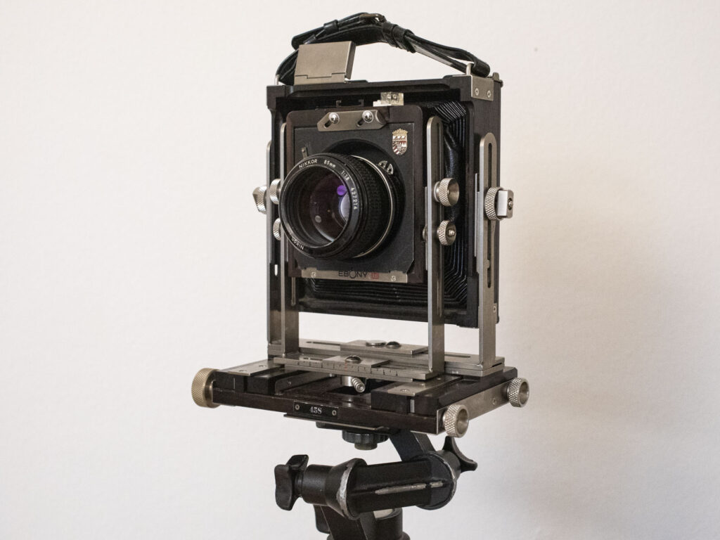 It started as a game, as an experiment, is that even possible? With which lens? Which lens has a suitable large circle to fit on a 4×5 inch. It was not easy and in the end the choice fell on Nikkon 35mm lenses, these usually have an 8-10 cm circle, the film is 10×15 cm. I used 50, 80 and 135mm – the classics.